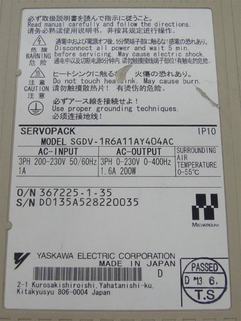 Used YASKAWA ELECTRIC SGDV-1R6A11AY404AC SERVO DRIVE