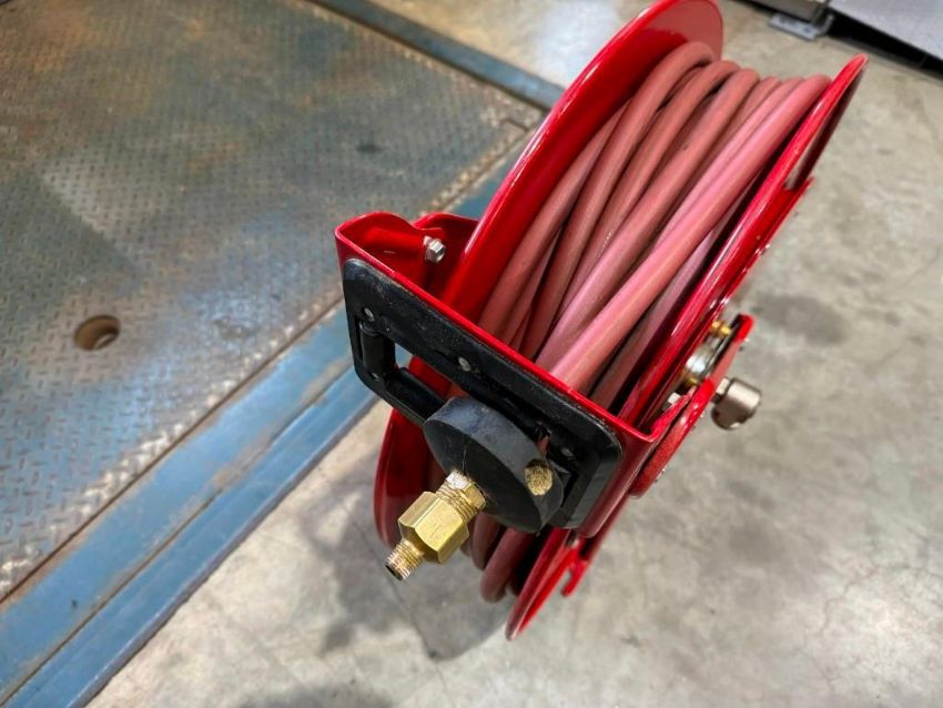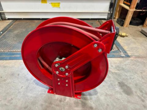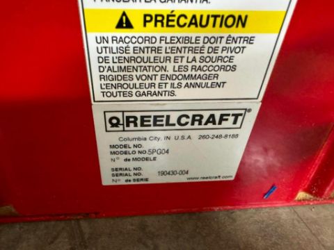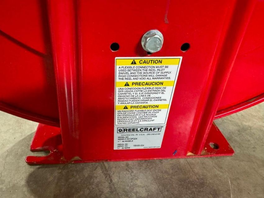 Used Reelcraft 5PG04 air reel with red OEM hose 1-2 inch hose and fittings with:
