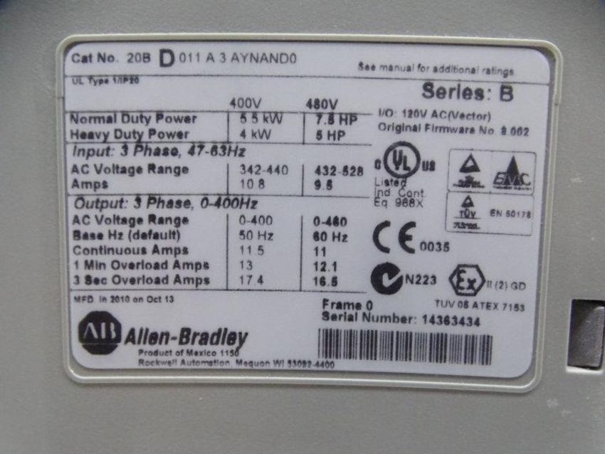 Refurbished ALLEN BRADLEY 20BD011A3AYNAND0 SERIES B DRIVE / Condition:Refurbished / Classification:Drive / Qty: 1