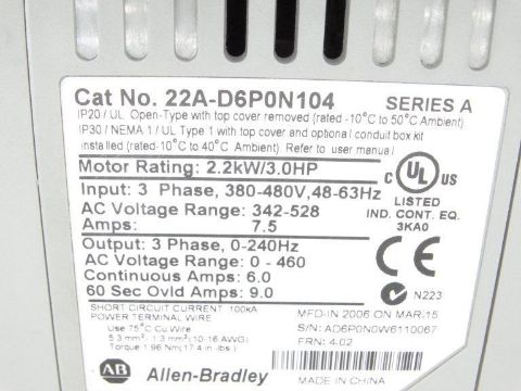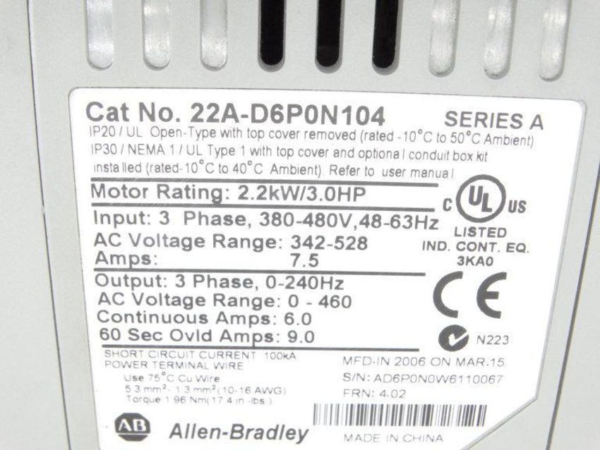 Refurbished ALLEN BRADLEY 22A-D6P0N104 SERIES A DRIVE / Condition:Refurbished / Classification:Drive / Qty: 1