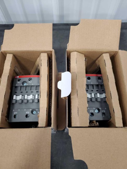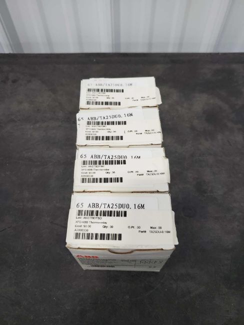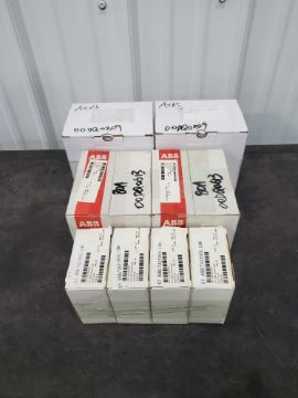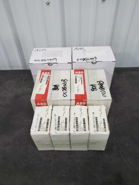 Lot of new in box ABB items including model numbers A1B 125 TMF 80-800 3p F F, AX65-30, and TA25DU-0.16M.