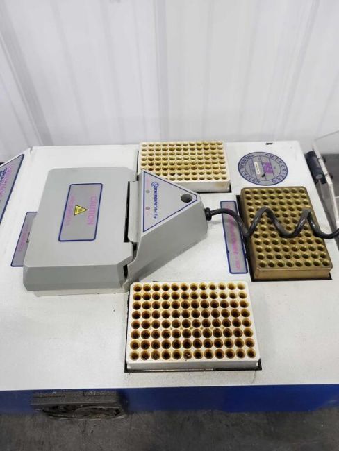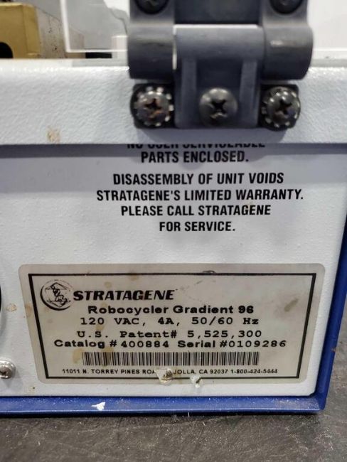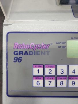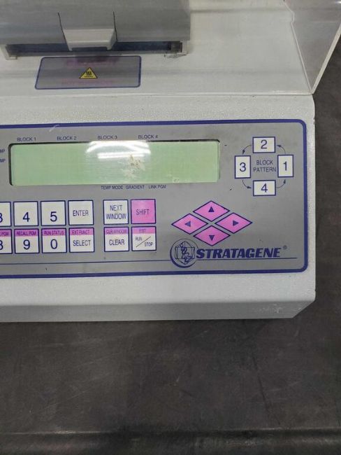 Used thermal cycler from Stratagene. Features include 4 blocks with independent settings allowing the operator to move samples through a variety of programmable temperature stages.