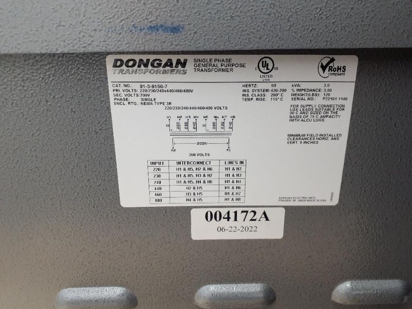 • Electrical: 1 Phase, 60 Hz, 200 Volts, 11 Amps