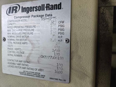 Used Ingersoll Rand Model: SSR-EP75 Air Compressor Unit with: